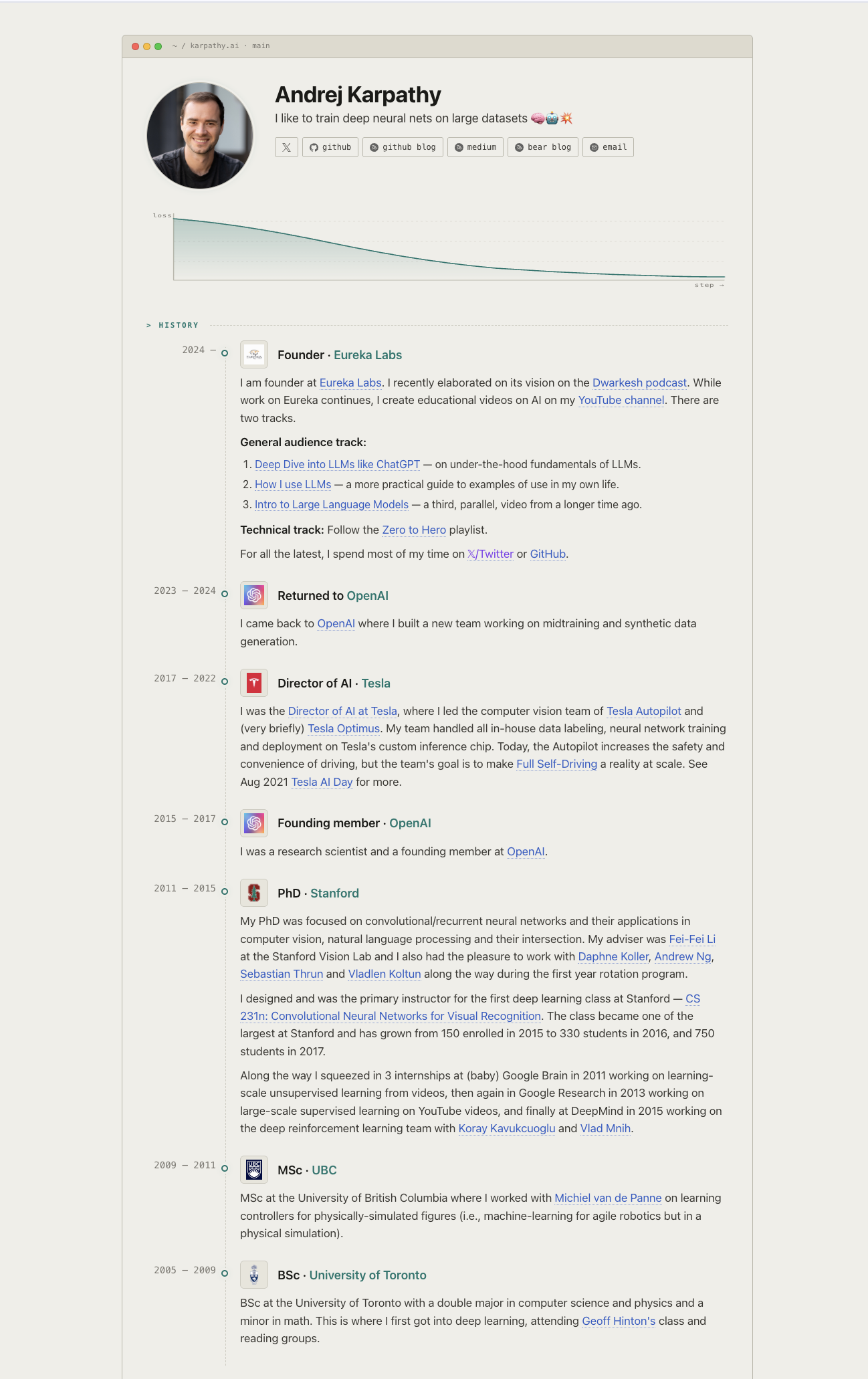 Andrej Karpathy @karpathy left an idea in an HTML comment on line 9 of his website: "have a javascript animated loss function converging in the header."
